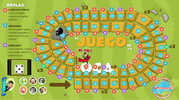 EJERCICIO FÍSICO (si no se realiza vuelve a la casilla anterior). DESCANSO (no se puede repetir 2 veces seguidas si esto ocurre tira de nuevo). PREGUNTA (si no aciertas vuelve a la casilla anterior y pierde turno)