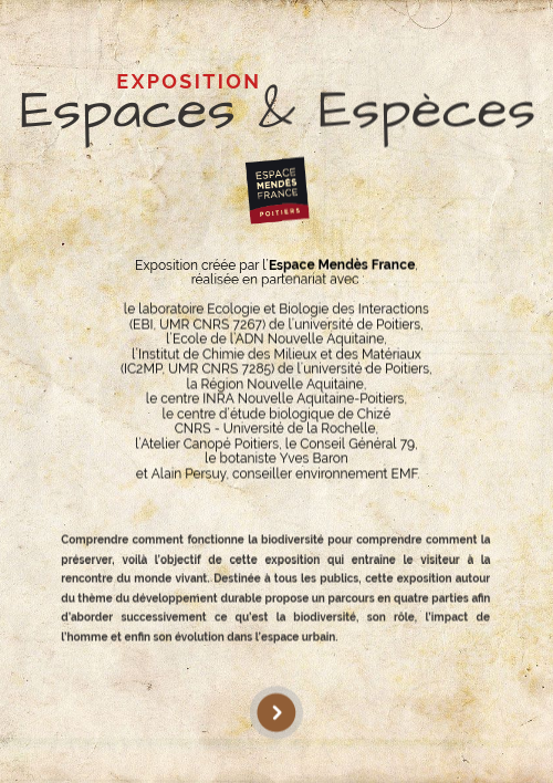Exposition créée par l’Espace Mendès France, réalisée en partenariat avec : le laboratoire Ecologie et Biologie des Interactions (EBI, UMR CNRS 7267) de l’université de Poitiers, l’Ecole de l’ADN Nouvelle Aquitaine, l’Institut de Chimie des Milieux et des Matériaux (IC2MP, UMR CNRS 7285) de l’université de Poitiers, la Région Nouvelle Aquitaine, le centre INRA Nouvelle Aquitaine-Poitiers, le centre d’étude biologique de Chizé CNRS - Université de la Rochelle, l’Atelier Canopé Poitiers, le Conseil Général 79, le botaniste Yves Baron et Alain Persuy, conseiller environnement EMF.