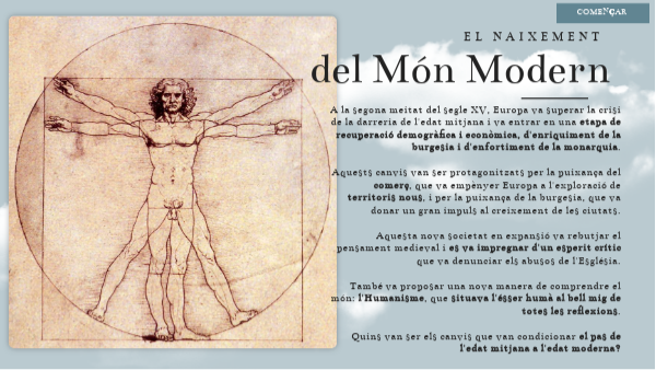 A la segona meitat del segle XV, Europa va superar la crisi de la darreria de l'edat mitjana i va entrar en una etapa de recuperació demogràfica i econòmica, d'enriquiment de la burgesia i d'enfortiment de la monarquia. Aquests canvis van ser protagonitzats per la puixança del comerç, que va empènyer Europa a l'exploració de territoris nous, i per la puixança de la burgesia, que va donar un gran impuls al creixement de les ciutats. Aquesta nova societat en expansió va rebutjar el pensament medieval i es va impregnar d'un esperit crític que va denunciar els abusos de l'Església. També va proposar una nova manera de comprendre el món: l'Humanisme, que situava l'ésser humà al bell mig de totes les reflexions. Quins van ser els canvis que van condicionar el pas de l'edat mitjana a l'edat moderna?