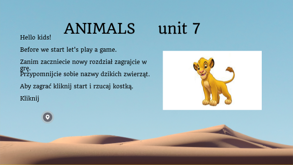 Hello kids! Before we start let's play a game. Zanim zaczniecie nowy rozdział zagrajcie w grę. Przypomnijcie sobie nazwy dzikich zwierząt. Aby zagrać kliknij start i rzucaj kostką. Kliknij