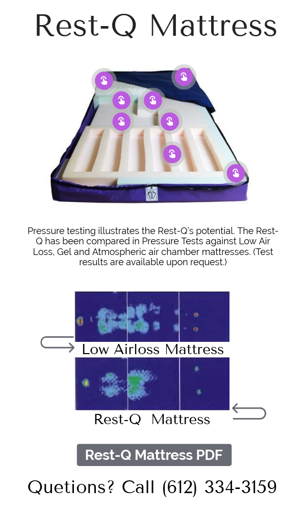 Pressure testing illustrates the Rest-Q’s potential. The Rest-Q has been compared in Pressure Tests against Low Air Loss, Gel and Atmospheric air chamber mattresses. (Test results are available upon request.)