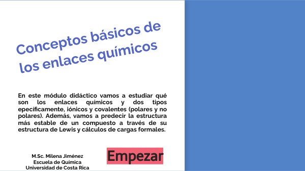 En este módulo didáctico vamos a estudiar qué son los enlaces químicos y dos tipos epecíficamente, iónicos y covalentes (polares y no polares). Además, vamos a predecir la estructura más estable de un compuesto a través de su estructura de Lewis y cálculos de cargas formales.