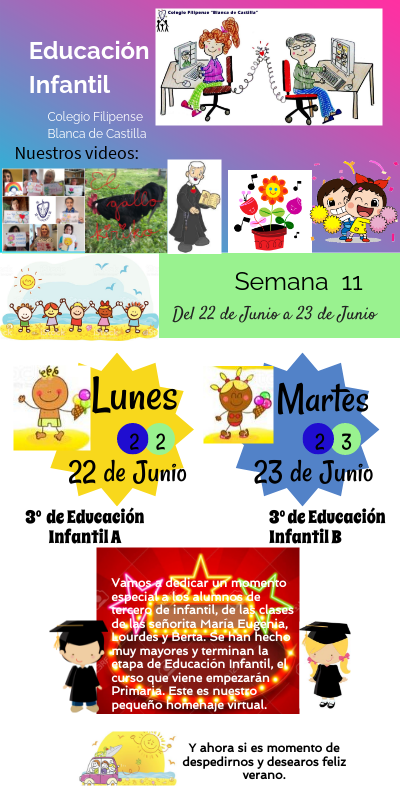 Vamos a dedicar un momento especial a los alumnos de tercero de infantil, de las clases de las señorita María Eugenia, Lourdes y Berta. Se han hecho muy mayores y terminan la etapa de Educación Infantil, el curso que viene empezarán Primaria. Este es nuestro pequeño homenaje virtual.