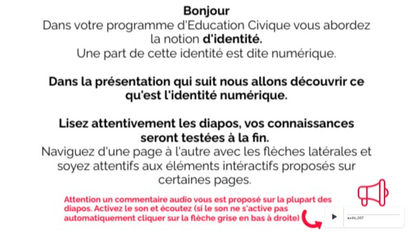 Bonjour Dans votre programme d'Education Civique vous abordez la notion d'identité. Une part de cette identité est dite numérique. Dans la présentation qui suit nous allons découvrir ce qu'est l'identité numérique. Lisez attentivement les diapos, vos connaissances seront testées à la fin. Naviguez d'une page à l'autre avec les flèches latérales et soyez attentifs aux éléments intéractifs proposés sur certaines pages.