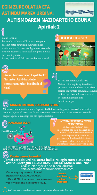 Kaixo familia: Zer moduz zabiltzate? Proposamen polit batekin gatoz gaurkoan. Apirilaren 2an Autismoaren Nazioarteko Eguna ospatzen da mundu osoan eta Talaiakoek ere gure aletxoa jarri nahi genuke. Baina, zuek ba al dakizue zer den autismoa?