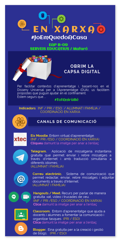 Per facilitar contextos d'aprenentatge i, basant-nos en el Disseny Universal per a l'Aprenentatge (DUA), us facilitem propostes que puguin ajudar en el confinament.Estem segurs que....