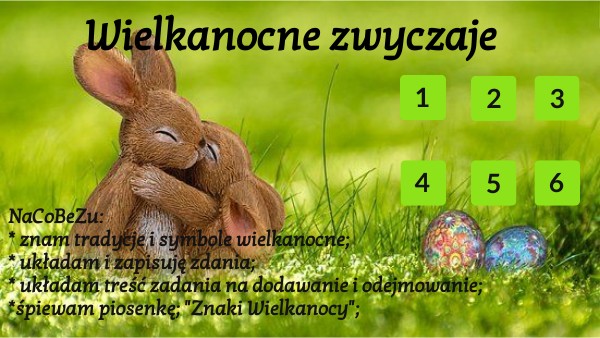 NaCoBeZu: * znam tradycje i symbole wielkanocne; * układam i zapisuję zdania; * układam treść zadania na dodawanie i odejmowanie; *śpiewam piosenkę; "Znaki Wielkanocy";