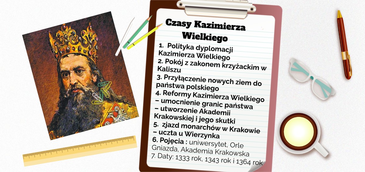 1. Polityka dyplomacji Kazimierza Wielkiego 2. Pokój z zakonem krzyżackim w Kaliszu 3. Przyłączenie nowych ziem do państwa polskiego 4. Reformy Kazimierza Wielkiego – umocnienie granic państwa – utworzenie Akademii Krakowskiej i jego skutki 5. zjazd monarchów w Krakowie – uczta u Wierzynka 6. Pojęcia : uniwersytet, Orle Gniazda, Akademia Krakowska 7. Daty: 1333 rok, 1343 rok i 1364 rok
