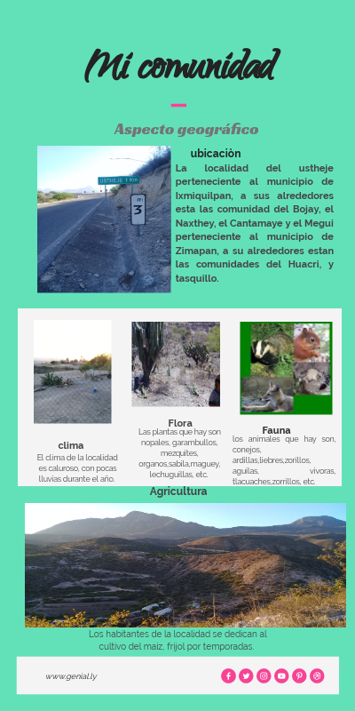 La localidad del ustheje perteneciente al municipio de Ixmiquilpan, a sus alrededores esta las comunidad del Bojay, el Naxthey, el Cantamaye y el Megui perteneciente al municipio de Zimapan, a su alrededores estan las comunidades del Huacri, y tasquillo.