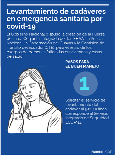 El Gobierno Nacional dispuso la creación de la Fuerza de Tarea Conjunta, integrada por las FF.AA., la Policía Nacional, la Gobernación del Guayas y la Comisión de Tránsito del Ecuador (CTE), para el retiro de los cuerpos de personas fallecidas en viviendas y casas de salud.