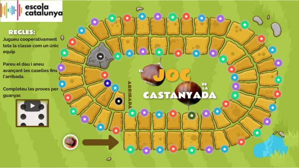 Jugueu cooperativament tota la classe com un únic equip Pareu el dau i aneu avançant les caselles fins l'arribada. Completeu les proves per guanyar.