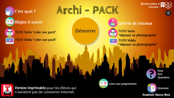 Archi - PACK est un dispositif destiné aux élèves dans le cadre des cours d’arts plastiques. Il s’agit de créer un "pack" de matériaux, préalablement réalisé avec peu de moyens, permettant de donner naissance à des volumes évocateurs d’architecture(s). Une commande est lancée sous forme de projet, et oriente la manière dont les éléments vont se combiner afin de créer une architecture. Cette entrée sera accompagnée d’un exemple d’architecture ancienne ou contemporaine existante. On peut aussi assembler un volume différent selon ses envies et son imagination sans tenir compte de l'incitation même si cette dernière constitue une difficulté à surmonter motivante.