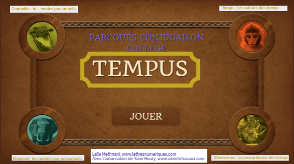 Parcours de révision sur la conjugaison française. Adressé aux élèves de cycle 4 et lycée, ce jeu "tempus" permet à l'élève de balayer tous les temps de la conjugaison française, les valeurs aspectuels des temps et les règles de concordance des temps. Réalisé avec l'aimable autorisation de Yann Houry auteur www.ralentirtravaux.com.