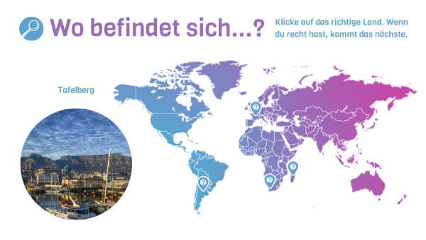 Klicke auf die einzelnen Stellen und zeige, wo sich die Orte befinden. Wie gut kennst du dich auf der Weltkarte aus?