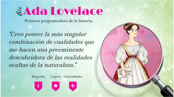 Ada Augusta Byron King popularmente conocida como Ana Lovelace nació el 10 de diciembre de 1815 en Inglaterra. Hija del gran poeta romántico Lord Byron, a quien nunca conoció, Ada, inició sus pasos dentro de las ciencias a muy corta edad. En 1833 comenzó a trabajar junto a Charles Babbage iniciándose rápidamente en el mundo de la programación. En 1843, Ada publicó una serie de notas sobre la máquina analítica de Babbage. Este invento, que nunca se construyó, fue el antecedente del ordenador moderno. Pero ella no sólo se encargaba de esa tarea, también realizaba aportes a dicha investigación. Como consta en los escritos, Ada interpretó las ideas del científico protoinformático y describió un lenguaje de programación cuyos aportes marcaron precedentes dentro de la historia de la informática.