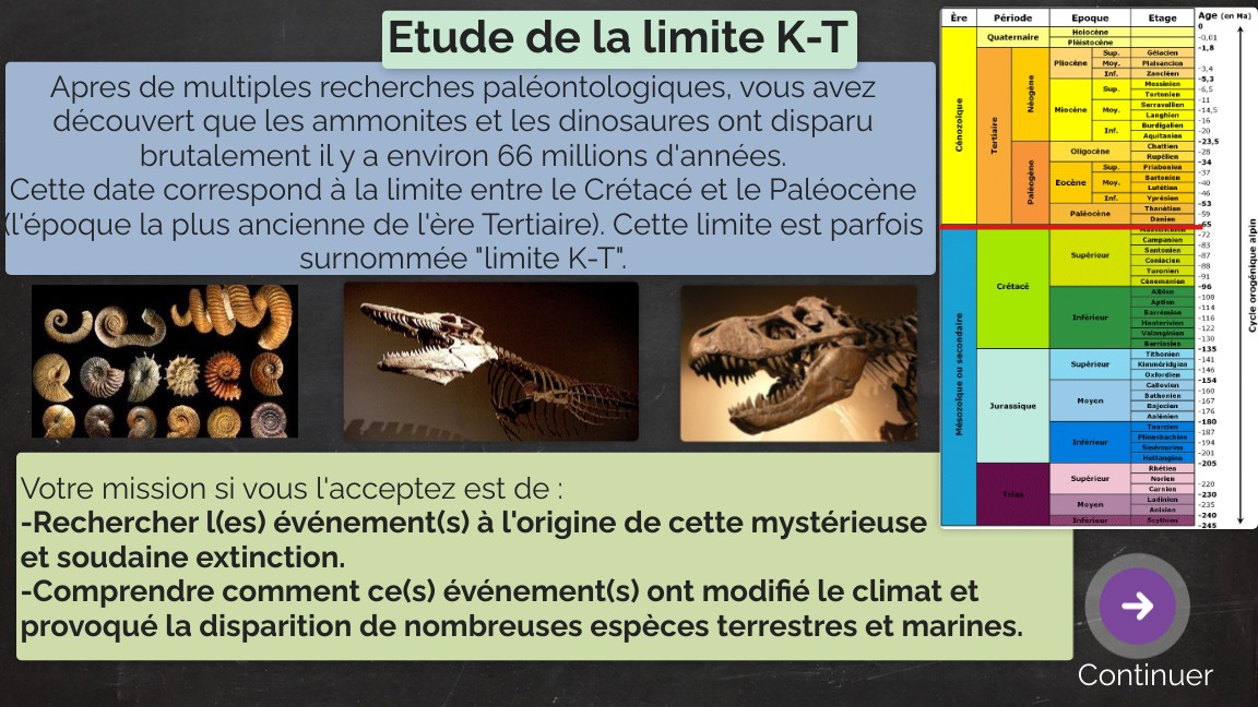 Votre mission si vous l'acceptez est de :-Rechercher l(es) événement(s) à l'origine de cette mystérieuse et soudaine extinction. -Comprendre comment ce(s) événement(s) ont modifié le climat et provoqué la disparition de nombreuses espèces terrestres et marines.