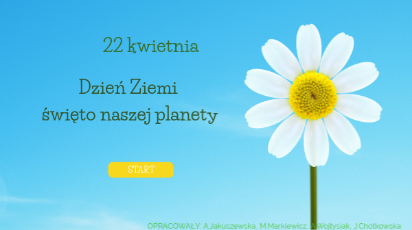 Dzień Ziemi po raz pierwszy świętowano 22 kwietnia 1970 roku w Stanach Zjednoczonych. Organizatorzy święta chcieli przekonać społeczeństwo do ochrony i odnowienia środowiska naturalnego oraz do zaspokajania potrzeb ludzi bez niszczenia środowiska. Amerykanie wyszli na ulice w tanecznych korowodach. Odbyło się wiele akcji ekologicznych, np. w Buffalo odbył się marsz ze szczotkami – przeciw zaśmiecaniu środowiska. Dwadzieścia lat później Dzień Ziemi był już świętowany w 140 krajach. Podczas festynów apelowano o oszczędzanie wody, ratowanie lasów tropikalnych.W Polsce Dzień Ziemi świętowano po raz pierwszy w 1990 roku. W Warszawie odbyły się spotkania, zajęcia plastyczne dla dzieci, koncerty oraz zabawy. Od tego czasu obchodzony jest co roku. Odbywają są akcje sadzenia drzew, sprzątania okolicznych terenów oraz festyny. Uczymy się codziennych zachowań proekologicznych i wiemy, że mamy wpływ na stan środowiska naturalnego i prostymi sposobami możemy zmniejszyć negatywne oddziaływanie na środowisko. A środowisko nam się odwdzięczy.