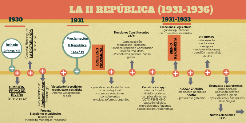 Elecciones Constituyentes 28/6 - Gana coalición republicano-socialista - Empieza redacción Constitución - División izda-dcha- - 1º conflictos sociales, con la iglesia...