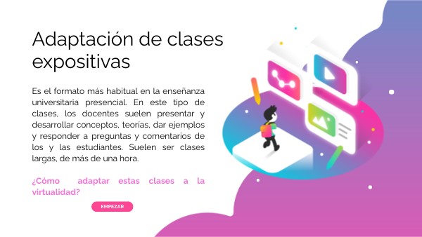 Es el formato más habitual en la enseñanza universitaria presencial. En este tipo de clases, los docentes suelen presentar y desarrollar conceptos, teorías, dar ejemplos y responder a preguntas y comentarios de los y las estudiantes. Suelen ser clases largas, de más de una hora. ¿Cómo adaptar estas clases a la virtualidad?