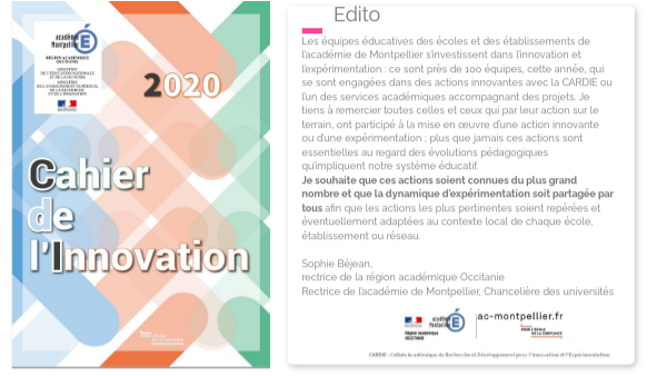 Les équipes éducatives des écoles et des établissements de l’académie de Montpellier s’investissent dans l’innovation et l’expérimentation : ce sont près de 100 équipes, cette année, qui se sont engagées dans des actions innovantes avec la CARDIE ou l’un des services académiques accompagnant des projets. Je tiens à remercier toutes celles et ceux qui par leur action sur le terrain, ont participé à la mise en œuvre d’une action innovante ou d’une expérimentation ; plus que jamais ces actions sont essentielles au regard des évolutions pédagogiques qu’impliquent notre système éducatif. Je souhaite que ces actions soient connues du plus grand nombre et que la dynamique d’expérimentation soit partagée par tous afin que les actions les plus pertinentes soient repérées et éventuellement adaptées au contexte local de chaque école, établissement ou réseau. Sophie Béjean, rectrice de la région académique OccitanieRectrice de l’académie de Montpellier, Chancelière des universités