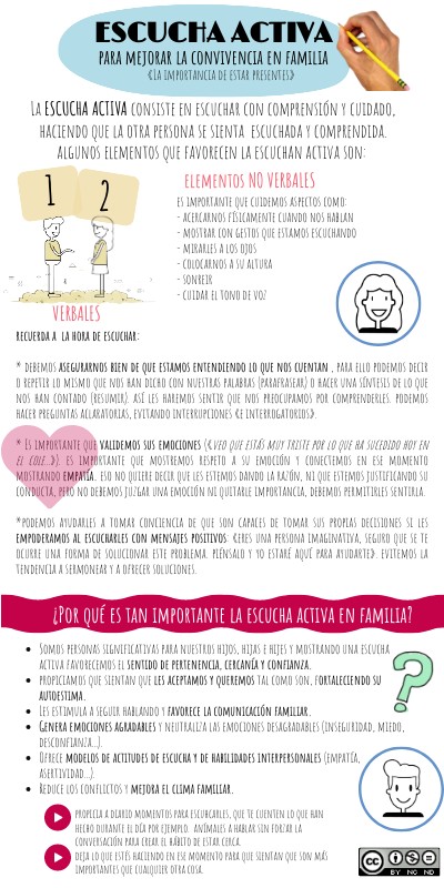recuerda a la hora de escuchar: * debemos asegurarnos bien de que estamos entendiendo lo que nos cuentan , para ello podemos decir o repetir lo mismo que nos han dicho con nuestras palabras (parafrasear) o hacer una síntesis de lo que nos han contado (resumir). así les haremos sentir que nos preocupamos por comprenderles. podemos hacer preguntas aclaratorias, evitando interrupciones «e interrogatorios». * Es importante que validemos sus emociones («veo que estás muy triste por lo que ha sucedido hoy en el cole...»). es importante que mostremos respeto a su emoción y conectemos en ese momento mostrando empatía. eso no quiere decir que les estemos dando la razón, ni que estemos justificando su conducta, pero no debemos juzgar una emoción ni quitarle importancia, debemos permitirles sentirla. *podemos ayudarles a tomar conciencia de que son capaces de tomar sus propias decisiones si les empoderamos al escucharles con mensajes positivos: «eres una persona imaginativa, seguro que se te ocurre una forma de solucionar este problema. piénsalo y yo estaré aquí para ayudarte». evitemos la tendencia a sermonear y a ofrecer soluciones.