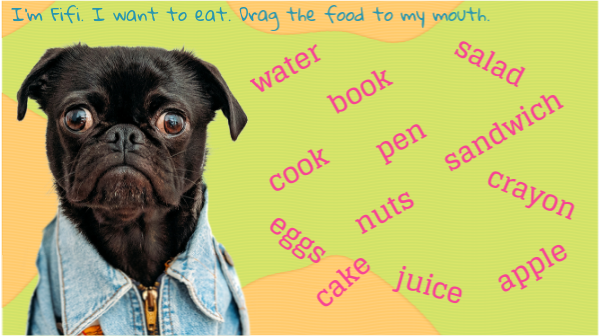 I'm Fifi. I want to eat. Drag the food to my mouth.