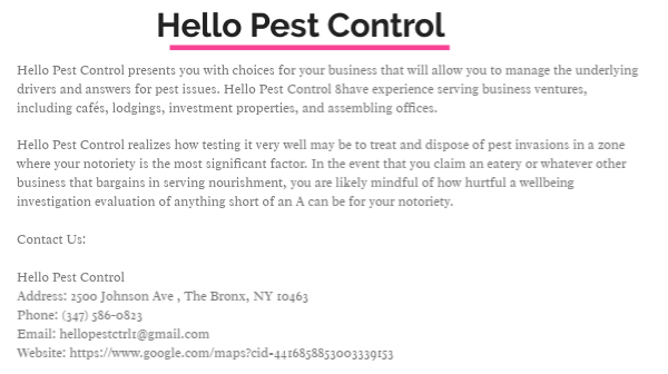 Hello Pest Control presents you with choices for your business that will allow you to manage the underlying drivers and answers for pest issues. Hello Pest Control 8have experience serving business ventures, including cafés, lodgings, investment properties, and assembling offices. Hello Pest Control realizes how testing it very well may be to treat and dispose of pest invasions in a zone where your notoriety is the most significant factor. In the event that you claim an eatery or whatever other business that bargains in serving nourishment, you are likely mindful of how hurtful a wellbeing investigation evaluation of anything short of an A can be for your notoriety. Contact Us: Hello Pest Control Address: 2500 Johnson Ave , The Bronx, NY 10463 Phone: (347) 586-0823 Email: hellopestctrl1@gmail.com Website: https://www.google.com/maps?cid=4416858853003339153