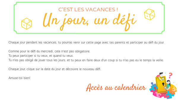 Chaque jour pendant les vacances, tu pourras venir sur cette page avec tes parents et participer au défi du jour. Comme pour le défi du mercredi, cela n'est pas obligatoire. Tu peux participer si tu veux, et quand tu veux. Tu n'es pas obligé de jouer tous les jours, et tu peux en faire deux d'un coup si tu n'as pas eu le temps la veille. Chaque jour, clique sur la date du jour et découvre le nouveau défi. Amuse-toi bien!