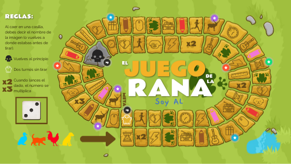 Al caer en una casilla, debes decir el nombre de la imagen (o vuelves a donde estabas antes de tirar). Vuelves al principio Dos turnos sin tirar Cuando lances el dado, el número se multiplica