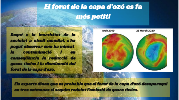 Degut a la inactivitat de la societat a nivell mundial, s'ha pogut observar com ha minvat la contaminació i en conseqüència la reducció de gasos tòxics i la disminució del forat de la capa d'ozó.