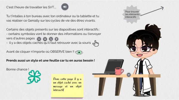 C'est l'heure de travailler les SVT.... Tu t'intalles à ton bureau avec ton ordinateur ou ta tablette et tu vas réaliser ce Genially sur les cycles de vie des êtres vivants. Certains des objets présents sur les diapositives sont intéractifs : - certains symboles vont te donner des informations ou t'envoyer vers d'autres pages - il y a des objets cachés qu'il faut retrouver avec la souris Avant de cliquer n'importe où OBSERVE bien !! Prends aussi un stylo et une feuille car tu en auras besoin ! Bonne chance !