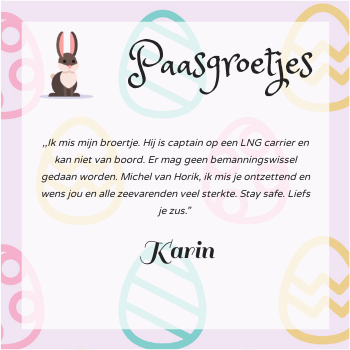 ,,Ik mis mijn broertje. Hij is captain op een LNG carrier en kan niet van boord. Er mag geen bemanningswissel gedaan worden. Michel van Horik, ik mis je ontzettend en wens jou en alle zeevarenden veel sterkte. Stay safe. Liefs je zus.”