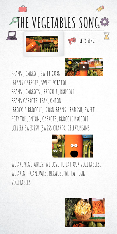 BEANS , CARROT, SWEET CORN BEANS CARROTS, SWEET POTATOE BEANS , CARROTS , BROCOLI, BROCOLI BEANS CARROTS, LEAK, ONION BROCOLI BROCOLI, CORN,BEANS, RADISH, SWEET POTATOE ,ONION, CARROTS, BROCOLI BROCOLI ,CELERY,SWEDISH (SWISS CHARD), CELERY,BEANS... WE ARE VEGETABLES, WE LOVE TO EAT OUR VEGETABLES, WE AREN'T CANIVALS, BECAUSE WE EAT OUR VEGETABLES.