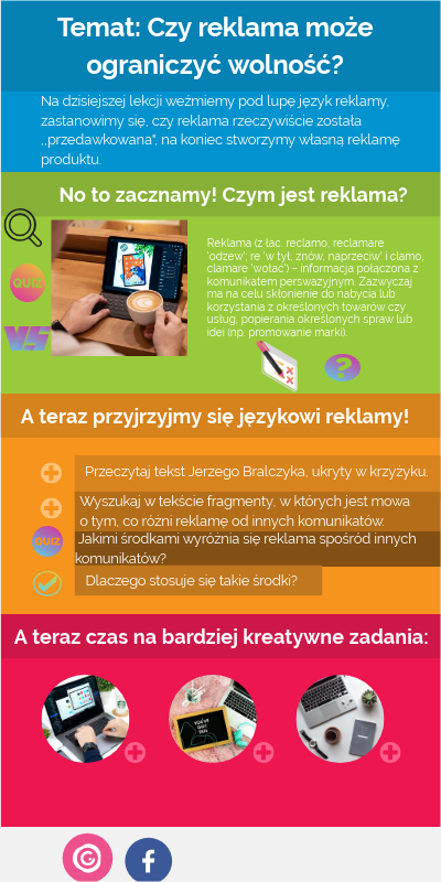 Na dzisiejszej lekcji weźmiemy pod lupę język reklamy, zastanowimy się, czy reklama rzeczywiście została ,,przedawkowana", na koniec stworzymy własną reklamę produktu.