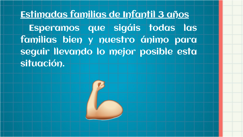 Estimadas familias de Infantil 3 años Esperamos que sigáis todas las familias bien y nuestro ánimo para seguir llevando lo mejor posible esta situación.