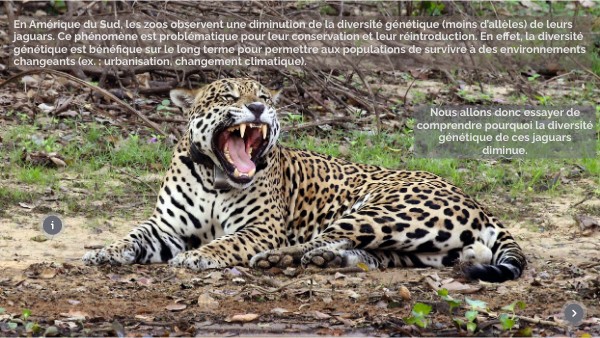En Amérique du Sud, les zoos observent une diminution de la diversité génétique (moins d’allèles) de leurs jaguars. Ce phénomène est problématique pour leur conservation et leur réintroduction. En effet, la diversité génétique est bénéfique sur le long terme pour permettre aux populations de survivre à des environnements changeants (ex. : urbanisation, changement climatique).