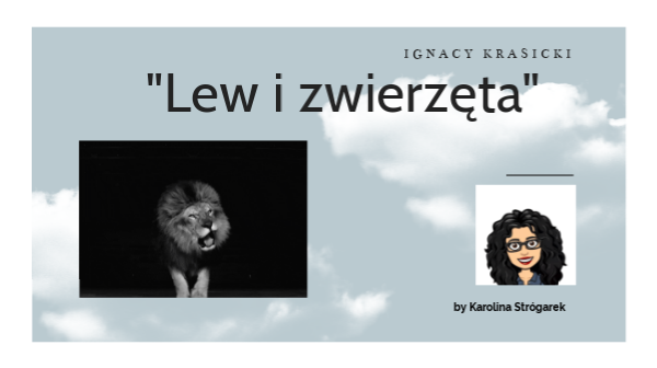 Ignacy KrasickiLew i zwierzęta Gdy się wszystkie zwierzęta u lwa znajdowały, Był dyskurs: jaki przymiot w zwierzu doskonały. Słoń roztropność zachwalał; żubr mienił powagę; Wielbłądy wstrzemięźliwość, lamparty odwagę, Niedźwiedź moc znamienitą, koń ozdobną postać; Wilk staranie przemyślne, jak zdobyczy dostać, Sarna kształtną subtelność, jeleń piękne rogi, Ryś odzienie wytworne, zając rącze nogi; Pies wierność, liszka umysł w fortele obfity; Baran łagodność, osieł żywot pracowity. Rzekł lew, gdy się go wszyscy o zdanie pytali: «Według mnie, ten najlepszy, co się najmniej chwali».