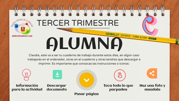 Claudia, este va a ser tu cuaderno de trabajo durante estos días, en algún caso trabajarás en el ordenador, otras en el cuaderno y otras tendrás que descargar e imprimir. Es importante que conozcas las instrucciones o iconos: