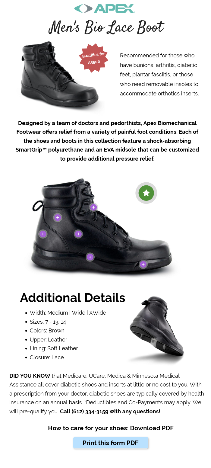 Apex Men's Bio Lace Boot is Designed by a team of doctors and pedorthists, Apex Biomechanical Footwear offers relief from a variety of painful foot conditions. Each of the shoes and boots in this collection feature a shock-absorbing SmartGrip™ polyurethane and an EVA midsole that can be customized to provide additional pressure relief. Recommended for those who have bunions, arthritis, diabetic feet, plantar fasciitis, or those who need removable insoles to accommodate orthotics inserts.