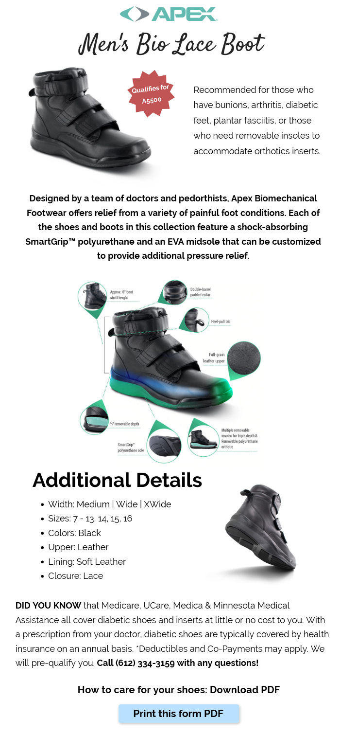 Apex Men's Bio Strap Boot is Designed by a team of doctors and pedorthists, Apex Biomechanical Footwear offers relief from a variety of painful foot conditions. Each of the shoes and boots in this collection feature a shock-absorbing SmartGrip™ polyurethane and an EVA midsole that can be customized to provide additional pressure relief. Recommended for those who have bunions, arthritis, diabetic feet, plantar fasciitis, or those who need removable insoles to accommodate orthotics inserts.