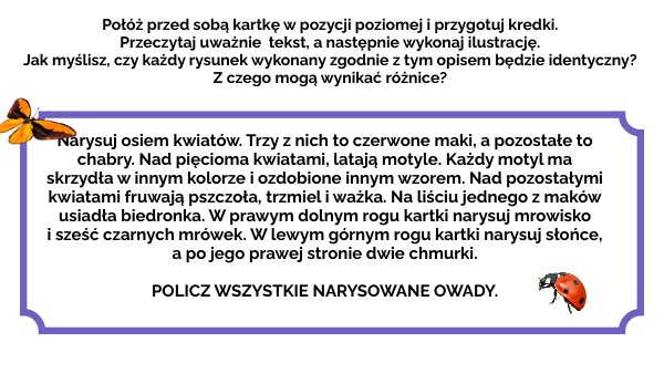 Narysuj osiem kwiatów. Trzy z nich to czerwone maki, a pozostałe to chabry. Nad pięcioma kwiatami, latają motyle. Każdy motyl ma skrzydła w innym kolorze i ozdobione innym wzorem. Nad pozostałymi kwiatami fruwają pszczoła, trzmiel i ważka. Na liściu jednego z maków usiadła biedronka. W prawym dolnym rogu kartki narysuj mrowisko i sześć czarnych mrówek. W lewym górnym rogu kartki narysuj słońce, a po jego prawej stronie dwie chmurki. POLICZ WSZYSTKIE NARYSOWANE OWADY.