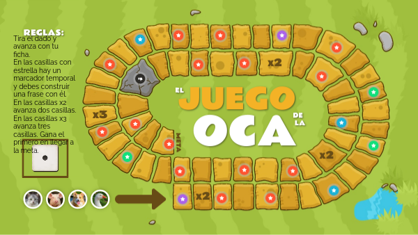Tira el dado y avanza con tu ficha.En las casillas con estrella hay un marcador temporal y debes construir una frase con él. En las casillas x2 avanza dos casillas.