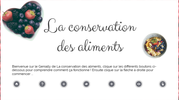 Bienvenue sur le Genially de La conservation des aliments, clique sur les différents boutons ci-dessous pour comprendre comment ça fonctionne ! Ensuite clique sur la flèche à droite pour commencer ... Ce genially fait parti du chapitre 4 Les micro-organismes, III) La conservation des aliments.