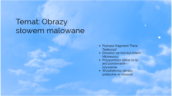 " na przykład jesiennaPełźnie jak żółw leniwa""Chmura z gradem jak balon szybko z wiatrem leci" "te białe chmurki (...) jak odmienne!Zrazu jak stada dzikich gęsi lub łabędzi" "wiatr jak sokół do kupy ję pędzi"