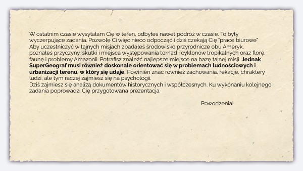 W ostatnim czasie wysyłałam Cię w teren, odbyłeś nawet podróż w czasie. To były wyczerpujące zadania. Pozwolę Ci więc nieco odpocząć i dziś czekają Cię "prace biurowe" Aby uczestniczyć w tajnych misjach zbadałeś środowisko przyrodnicze obu Ameryk, poznałeś przyczyny, skutki i miejsca występowania tornad i cyklonów tropikalnych oraz florę, faunę i problemy Amazonii. Potrafisz znaleźć najlepsze miejsce na bazę tajnej misji. Jednak SuperGeograf musi również doskonale orientować się w problemach ludnościowych i urbanizacji terenu, w który się udaje. Powinien znać również zachowania, rekacje, chraktery ludzi, ale tym raczej zajmiesz się na psychologii. Dziś zajmiesz się analizą dokumentów historycznych i współczesnych. Ku wykonaniu kolejnego zadania poprowadzi Cię przygotowana prezentacja. Powodzenia!