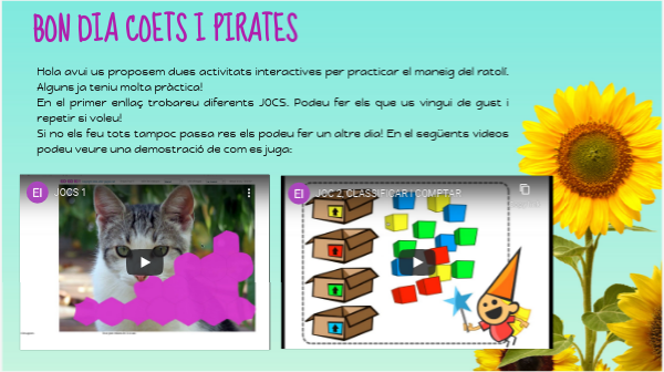 Hola avui us proposem dues activitats interactives per practicar el maneig del ratolí. Alguns ja teniu molta pràctica! En el primer enllaç trobareu diferents JOCS. Podeu fer els que us vingui de gust i repetir si voleu!Si no els feu tots tampoc passa res els podeu fer un altre dia! En el següents videos podeu veure una demostració de com es juga: