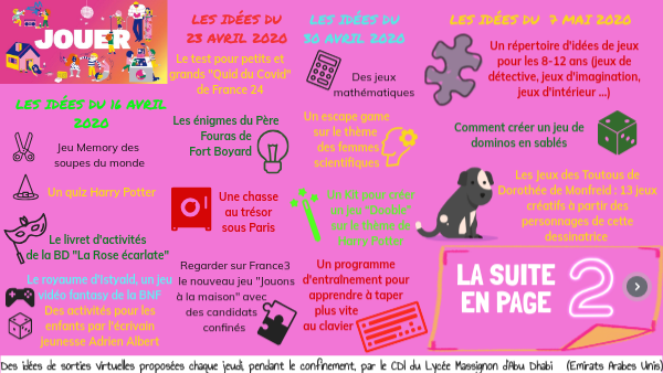 Des idées de sorties virtuelles proposées chaque jeudi, pendant le confinement, par le CDI du Lycée Massignon d'Abu Dhabi (Emirats Arabes Unis)