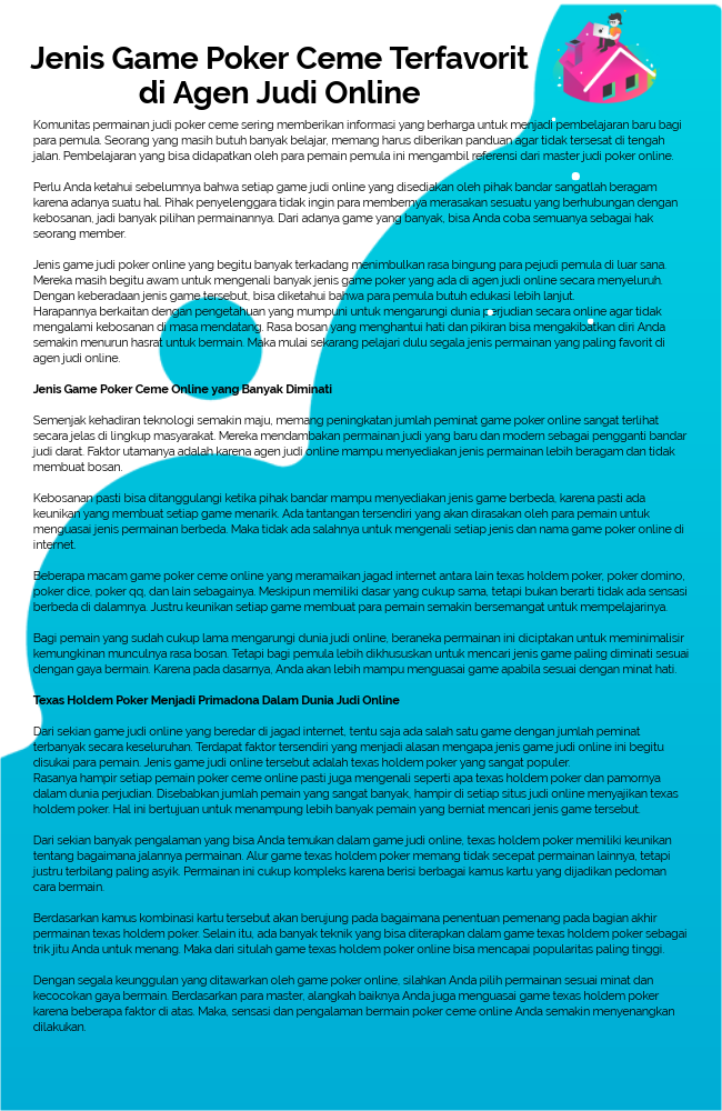 Komunitas permainan judi poker ceme sering memberikan informasi yang berharga untuk menjadi pembelajaran baru bagi para pemula. Seorang yang masih butuh banyak belajar, memang harus diberikan panduan agar tidak tersesat di tengah jalan. Pembelajaran yang bisa didapatkan oleh para pemain pemula ini mengambil referensi dari master judi poker online. Perlu Anda ketahui sebelumnya bahwa setiap game judi online yang disediakan oleh pihak bandar sangatlah beragam karena adanya suatu hal. Pihak penyelenggara tidak ingin para membernya merasakan sesuatu yang berhubungan dengan kebosanan, jadi banyak pilihan permainannya. Dari adanya game yang banyak, bisa Anda coba semuanya sebagai hak seorang member. Jenis game judi poker online yang begitu banyak terkadang menimbulkan rasa bingung para pejudi pemula di luar sana. Mereka masih begitu awam untuk mengenali banyak jenis game poker yang ada di agen judi online secara menyeluruh. Dengan keberadaan jenis game tersebut, bisa diketahui bahwa para pemula butuh edukasi lebih lanjut. Harapannya berkaitan dengan pengetahuan yang mumpuni untuk mengarungi dunia perjudian secara online agar tidak mengalami kebosanan di masa mendatang. Rasa bosan yang menghantui hati dan pikiran bisa mengakibatkan diri Anda semakin menurun hasrat untuk bermain. Maka mulai sekarang pelajari dulu segala jenis permainan yang paling favorit di agen judi online. Jenis Game Poker Ceme Online yang Banyak Diminati Semenjak kehadiran teknologi semakin maju, memang peningkatan jumlah peminat game poker online sangat terlihat secara jelas di lingkup masyarakat. Mereka mendambakan permainan judi yang baru dan modern sebagai pengganti bandar judi darat. Faktor utamanya adalah karena agen judi online mampu menyediakan jenis permainan lebih beragam dan tidak membuat bosan. Kebosanan pasti bisa ditanggulangi ketika pihak bandar mampu menyediakan jenis game berbeda, karena pasti ada keunikan yang membuat setiap game menarik. Ada tantangan tersendiri yang akan dirasakan oleh para pemain untuk menguasai jenis permainan berbeda. Maka tidak ada salahnya untuk mengenali setiap jenis dan nama game poker online di internet. Beberapa macam game poker ceme online yang meramaikan jagad internet antara lain texas holdem poker, poker domino, poker dice, poker qq, dan lain sebagainya. Meskipun memiliki dasar yang cukup sama, tetapi bukan berarti tidak ada sensasi berbeda di dalamnya. Justru keunikan setiap game membuat para pemain semakin bersemangat untuk mempelajarinya. Bagi pemain yang sudah cukup lama mengarungi dunia judi online, beraneka permainan ini diciptakan untuk meminimalisir kemungkinan munculnya rasa bosan. Tetapi bagi pemula lebih dikhususkan untuk mencari jenis game paling diminati sesuai dengan gaya bermain. Karena pada dasarnya, Anda akan lebih mampu menguasai game apabila sesuai dengan minat hati. Texas Holdem Poker Menjadi Primadona Dalam Dunia Judi Online Dari sekian game judi online yang beredar di jagad internet, tentu saja ada salah satu game dengan jumlah peminat terbanyak secara keseluruhan. Terdapat faktor tersendiri yang menjadi alasan mengapa jenis game judi online ini begitu disukai para pemain. Jenis game judi online tersebut adalah texas holdem poker yang sangat populer. Rasanya hampir setiap pemain poker ceme online pasti juga mengenali seperti apa texas holdem poker dan pamornya dalam dunia perjudian. Disebabkan jumlah pemain yang sangat banyak, hampir di setiap situs judi online menyajikan texas holdem poker. Hal ini bertujuan untuk menampung lebih banyak pemain yang berniat mencari jenis game tersebut. Dari sekian banyak pengalaman yang bisa Anda temukan dalam game judi online, texas holdem poker memiliki keunikan tentang bagaimana jalannya permainan. Alur game texas holdem poker memang tidak secepat permainan lainnya, tetapi justru terbilang paling asyik. Permainan ini cukup kompleks karena berisi berbagai kamus kartu yang dijadikan pedoman cara bermain. Berdasarkan kamus kombinasi kartu tersebut akan berujung pada bagaimana penentuan pemenang pada bagian akhir permainan texas holdem poker. Selain itu, ada banyak teknik yang bisa diterapkan dalam game texas holdem poker sebagai trik jitu Anda untuk menang. Maka dari situlah game texas holdem poker online bisa mencapai popularitas paling tinggi. Dengan segala keunggulan yang ditawarkan oleh game poker online, silahkan Anda pilih permainan sesuai minat dan kecocokan gaya bermain. Berdasarkan para master, alangkah baiknya Anda juga menguasai game texas holdem poker karena beberapa faktor di atas. Maka, sensasi dan pengalaman bermain poker ceme online Anda semakin menyenangkan dilakukan.