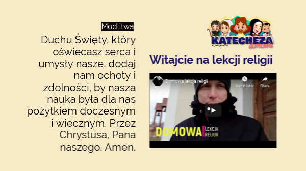 Duchu Święty, który oświecasz serca i umysły nasze, dodaj nam ochoty i zdolności, by nasza nauka była dla nas pożytkiem doczesnym i wiecznym. Przez Chrystusa, Pana naszego. Amen.