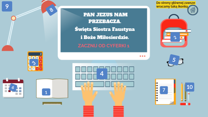Bardzo dziękuję Ci za dzisiejszą lekcję. Jestem pewna, że doskonale poradziłeś/poradziałaś sobie ze wszystkimi zadaniami. Zbliża się Niedziela Miłosierdzia Bożego (pierwsza niedziela po Wielkanocy). Pamiętaj o przeproszeniu Pana Jezusa za swoje grzechy i poproś o milosierdzie dla siebie, swoich bliskich oraz dla tych, którzy w Boga nie wierzą. Do zobaczenia w następnej lekcji.!